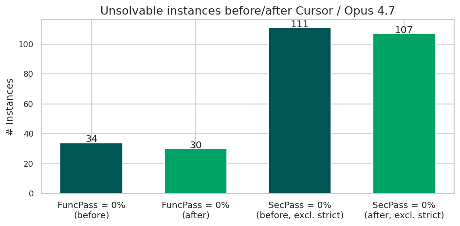 Inconveniently for our digital-ink-still-drying narrative, but conveniently for security practitioners and developers (which is what matters, I suppose), Opus 4.7 breaks that pattern. Not only does it push the functional frontier to 91.1%, but it also delivers the largest single-model jump in security scores we've recorded. Cursor + Opus 4.7 reaches 22.9% SecPass, a 5.6 percentage-point improvement over the previous best — and a nearly 3x improvement over the same agent paired with Opus 4.6 (which scored 7.8%). Claude Code shows the same trajectory: security rises from 8.4% with Opus 4.6 to 20.1% with Opus 4.7.
