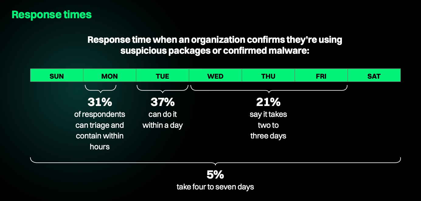 While 31% of organizations say they can triage and contain a confirmed malicious package within hours, 26% take two days or more, a window in which a compromised dependency can exfiltrate credentials, harvest secrets, and establish persistence across cloud environments.