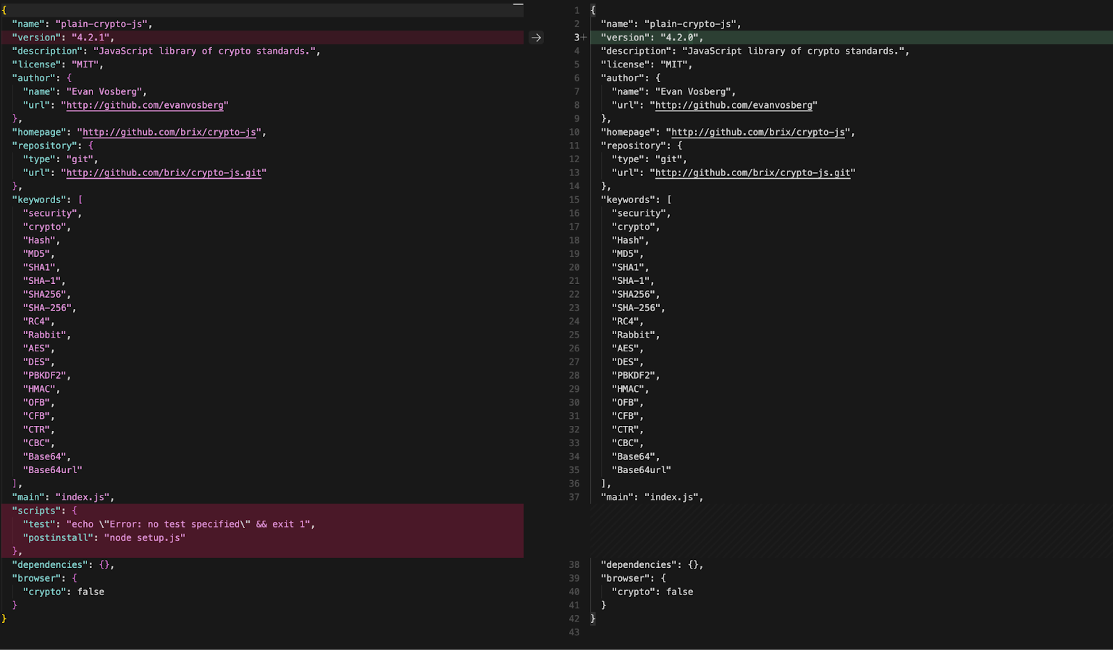 The package.md file is shipped inside the npm package as a decoy. It is a valid package.json for version 4.2.0 with no scripts section. After the swap, any post-infection inspection of node_modules/plain-crypto-js/package.json shows a completely clean manifest with no indication anything malicious was installed. Running npm audit or manually reviewing the installed package directory will not reveal the compromise.
