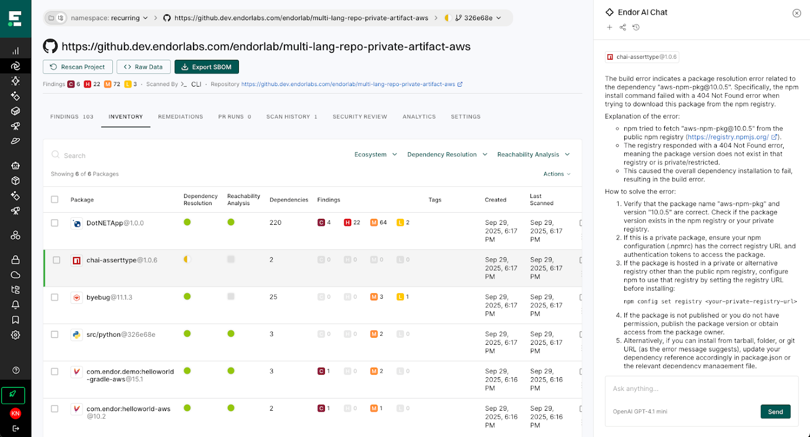 To help users understand what happens to a package within a project during scans, agentic chat can quickly explain package resolution and reachability errors, and suggest ways to fix them. By entering the error message, the chat retrieves the full context, making it easier to troubleshoot issues without digging through multiple pages.