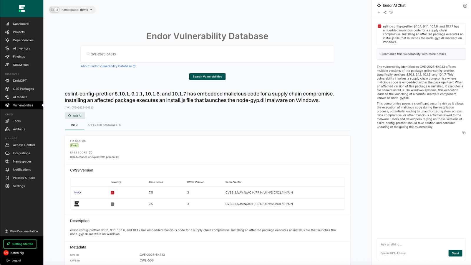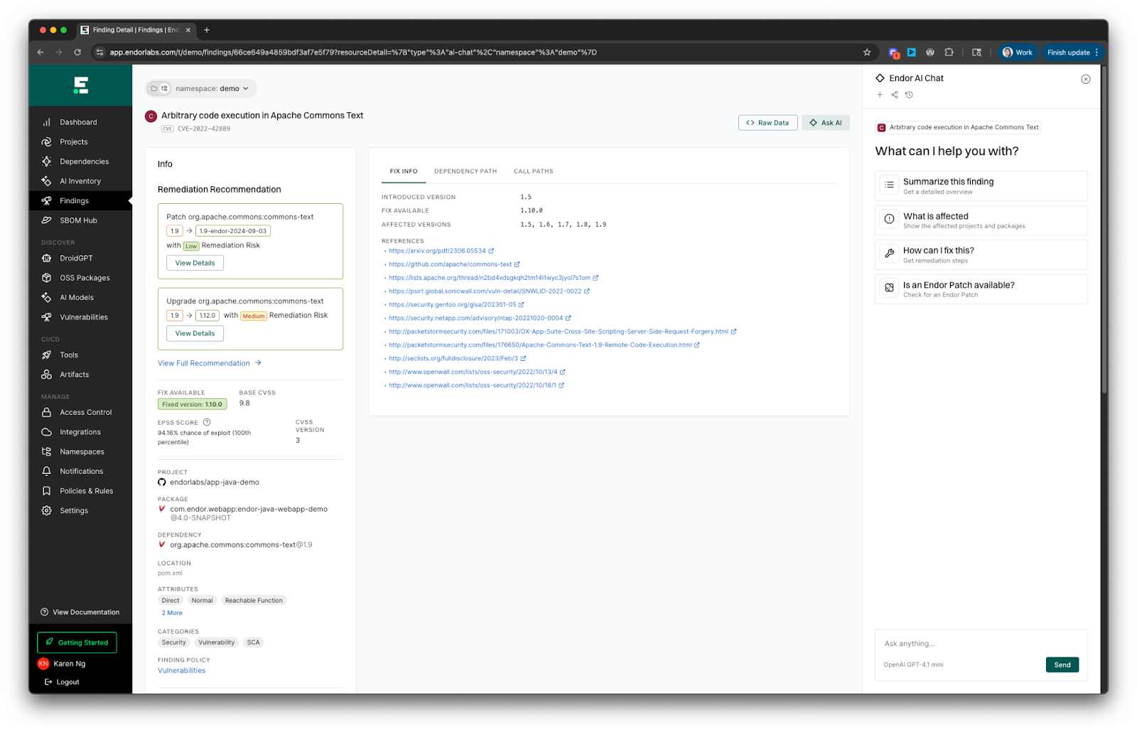 Ask the chat for more context on any finding. It pulls enriched details from the Endor Labs vulnerability search and guides you a step further with your investigation.