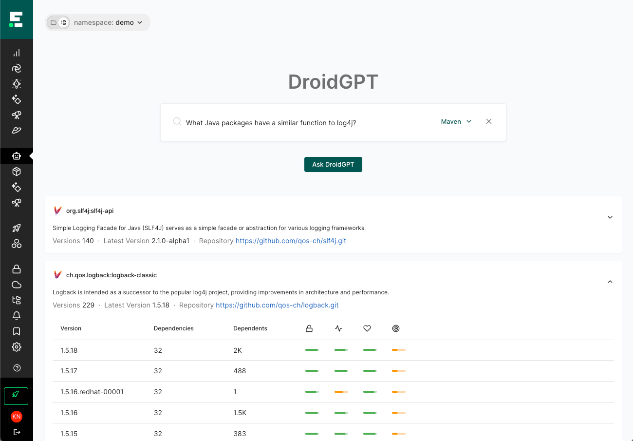 Getting instant answers, including risk scores of each packages, from ask DroidGPT