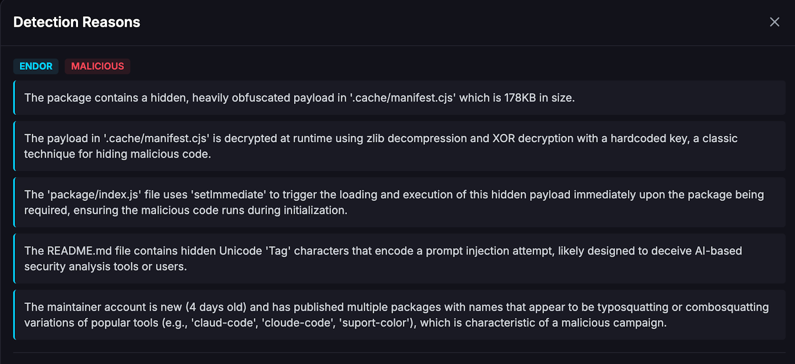 At the same time, sophistication does not equate to invisibility. While techniques such as MCP injection and AI toolchain manipulation introduce new layers of complexity, they also create detectable patterns across package behavior, workflow modification, dependency anomalies, and configuration tampering. With effective initial triage and behavioral correlation, detection systems can rapidly surface these signals and escalate into deeper analysis, enabling faster response and swifter protection for customers.