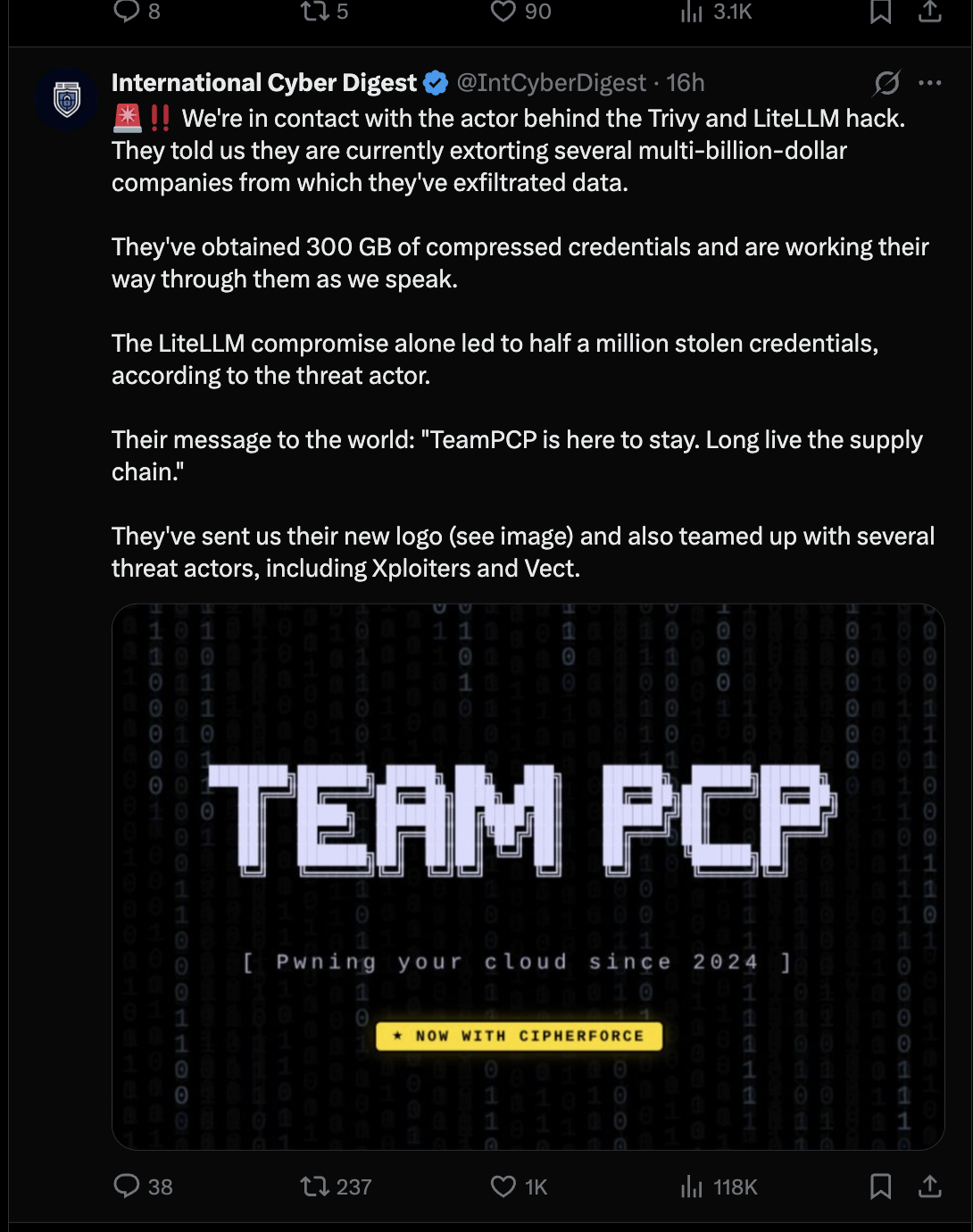 The group known as TeamPCP started with one incomplete incident response at Aqua Security in late February. From there, they pivoted to Trivy's GitHub Actions, Docker Hub, npm, OpenVSX, and PyPI. They compromised security vendors Aqua and Checkmarx. They backdoored litellm, an AI infrastructure package with 95 million monthly downloads. And they're almost certainly not done.