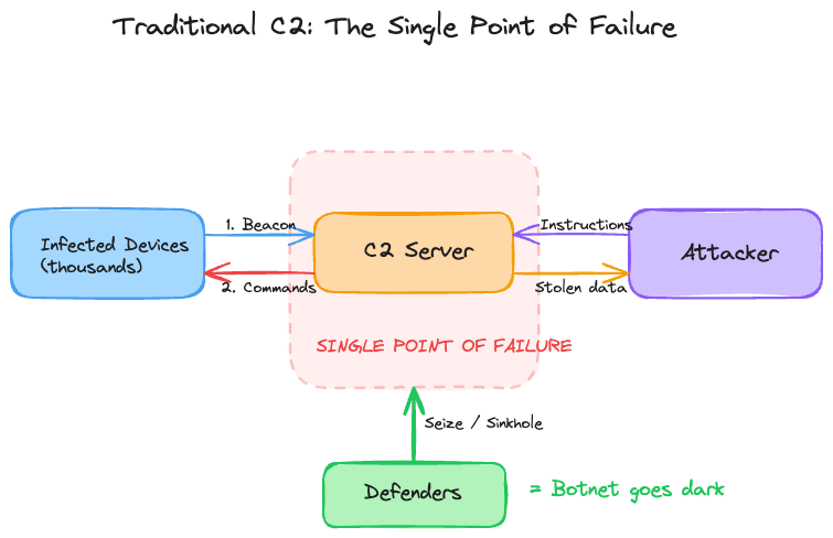 For decades, the C2 server has been the weak point in every malware operation. If defenders find and remove it, the entire campaign stops.