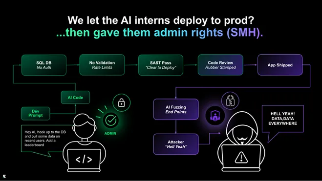And along comes a hacker with an AI assistant of their own. Using AI fuzzing, they prompt their LLM to “Test some edge cases. What if users were admins? ” The LLM delivers. Suddenly, a leaderboard query turns into a full data exfiltration script. Tons of PII breached!