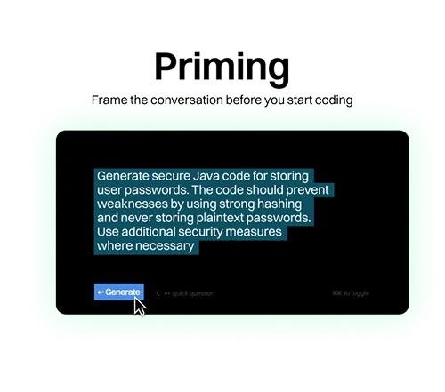 Priming: Frame the entire conversation before the code generation begins. It's a "single-shot" approach where you tell the LLM up front what to do and which security principles to follow. This is useful for establishing the security requirements from the very start.
