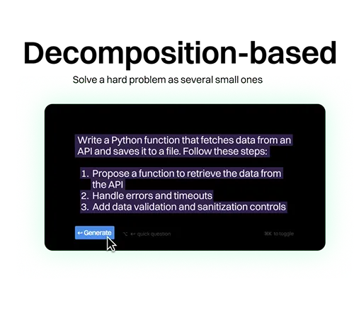 Decomposition: Solve a hard problem by breaking it into several smaller ones and prompting the LLM for each step sequentially. By breaking the task into steps, you can explicitly inject security requirements, such as "Add data validation and sanitization controls," into the subtasks.